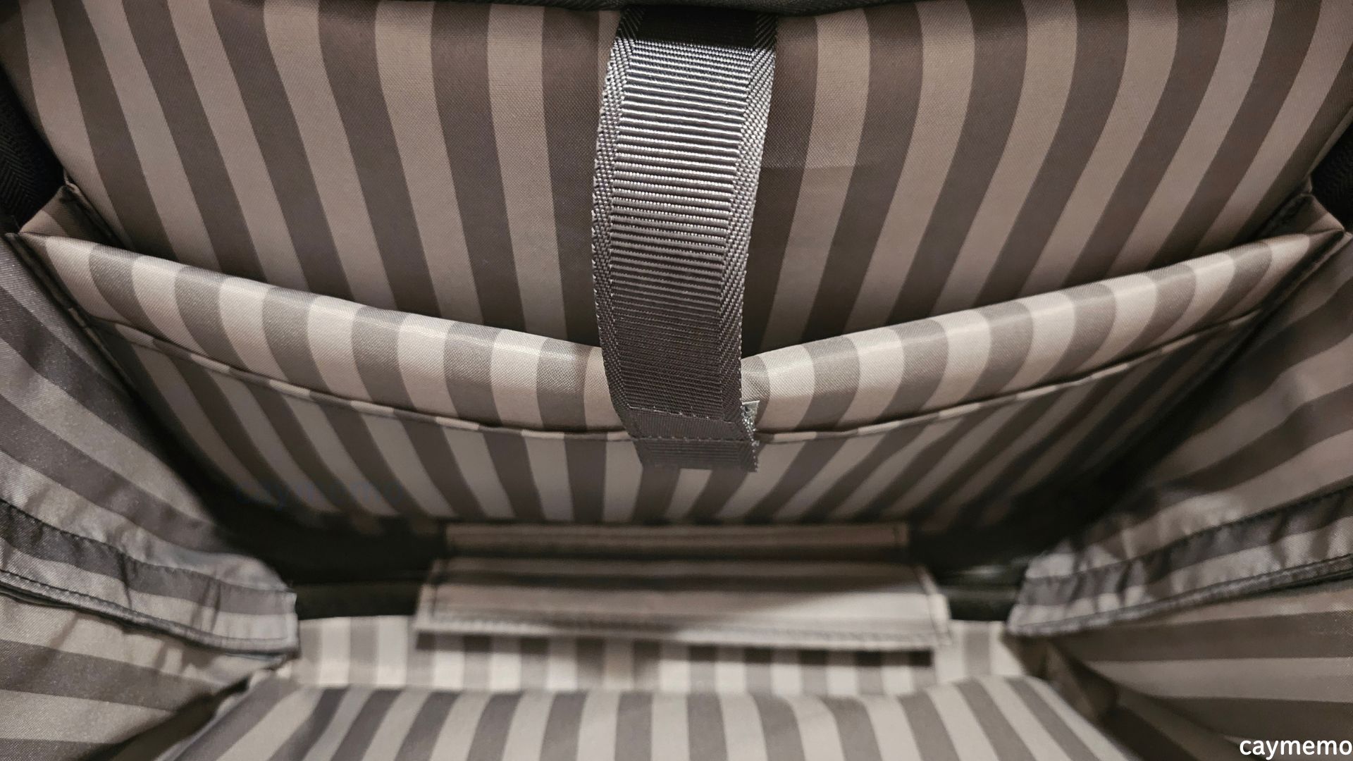 実際に見ると分かりやすいのですが、フロント側はこのような内側の構造になっています。フロントポケットの裏の部分は平たいものくらいしか入らなくて、ポケットがない下の方だけはもう片方と同じ深さものが入れられる、という感じです。